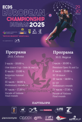Европейско първенство по спортни танци ще се проведе на 29 и 30 ноември 2025 г. в Спортна зала „Бойчо Брънзов“, гр. Бургас. Шампионатът се организира от Българската федерация на клубовете по спортни танци (БФКСТ) и клуб по спортни танци „Нефтохимик-78“ – Бургас, с подкрепата и съдействието на Министерството на младежта и спорта, Европейската конфедерация по […]