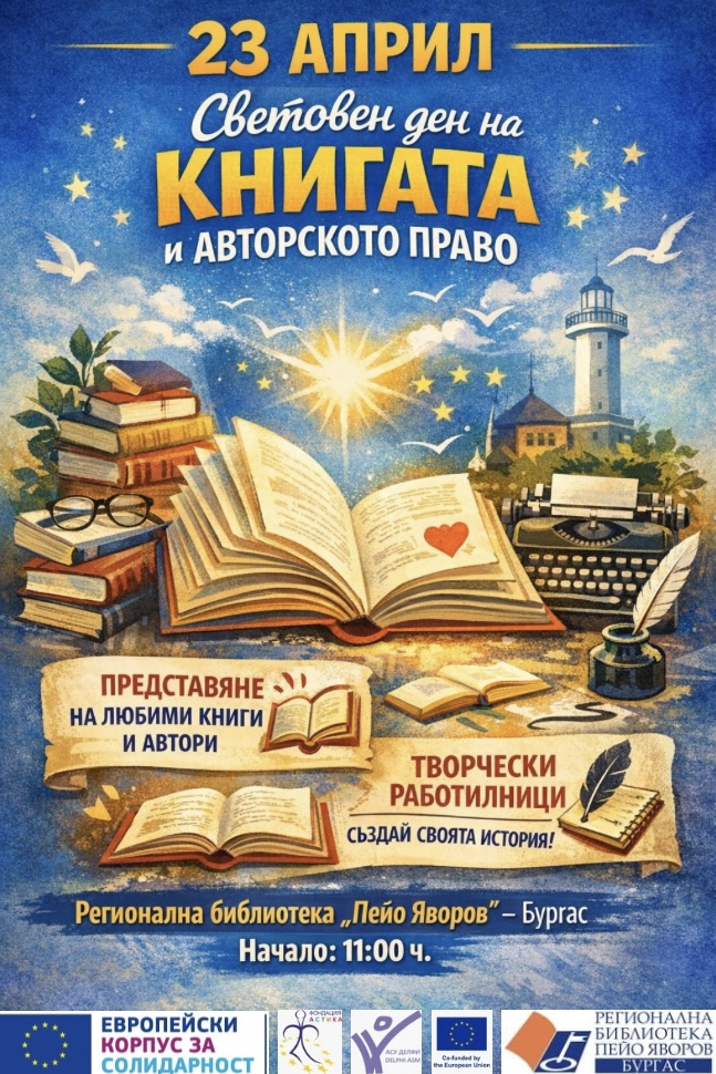 На 23 април 2026 г. (четвъртък) от 11:00 часа в Изложбената зала на Регионална библиотека– Бургас ще бъде отбелязан Световният ден на книгата и авторските права с празнична програма, посветена на любовта към книгите, четенето и творческото вдъхновение. Събитието се организира с участието на доброволци по програма „Европейски корпус за солидарност“, които ще посрещнат посетителите […]