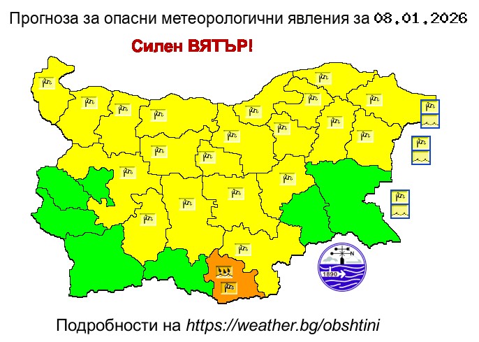 За 08.01.2026 г. НИМХ-МОСВ издава предупреждение от оранжев код за територии на област Кърджали за силен вятър, придружен от значителни валежи от дъжд. Жълт код за силен вятър е обявен за територии на областите Бургас, Варна, Велико Търново, Видин, Враца, Габрово, Добрич, Кърджали, Ловеч, Монтана, Пазарджик, Плевен, Пловдив, Разград, Русе, Силистра, Софийска, Сливен, Стара Загора, […]