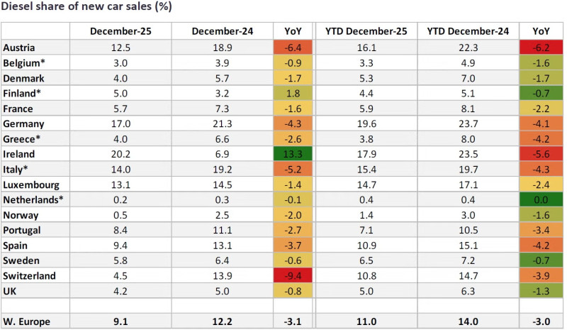 Продажбите на нови дизелови автомобили продължават да намаляват в Западна Европа и през 2025 година. Данните на GlobalData за изминалата календарна година сочат, че пазарният им дял се е свил от 14% през 2024 до едва 11% през 2025-а, като общата реализация на бизнеса е била на ниво от малко под 1.3 милиона единици. Точният […]
